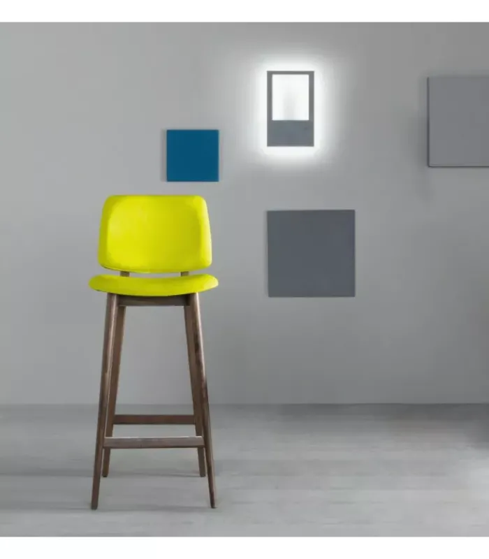 Sgabello con telaio in frassino tinto naturale, noce o rovere bruciato. Seduta e schienale rivestiti in ecopelle bianco ghiaccio, grigio cenere, argilla; pelle bianca, grigio antracite, grigio lava; tessuto karina blu elettrico, grigio lava, tortora, verde acido, verde oliva, cuciture tono su tono. Seduta h. 65 cm.