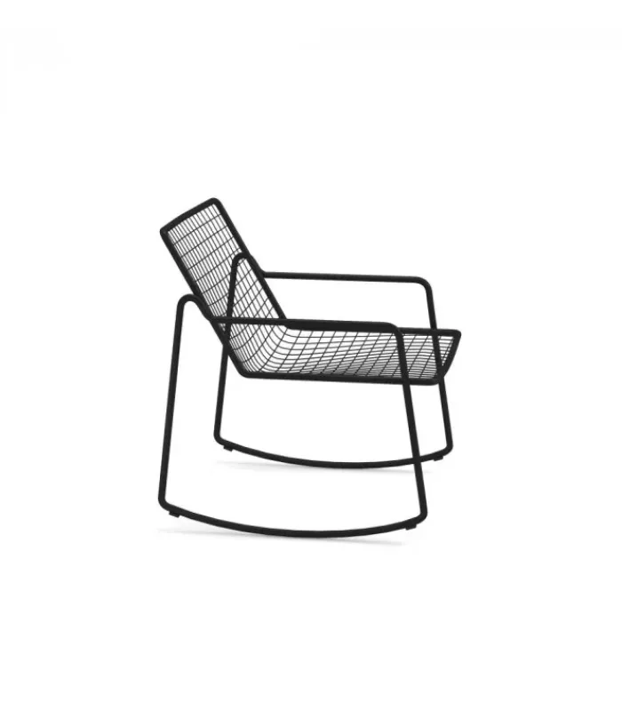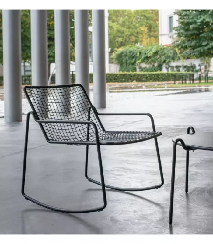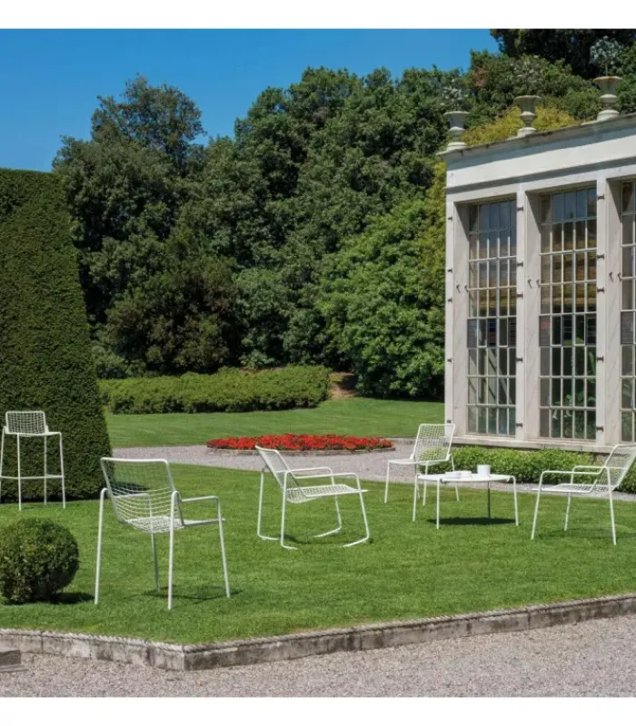 Poltrona con seduta e schienale a rete intrecciata in acciaio pre zincato a caldo e verniciato. La struttura è in acciaio verniciato. È disponibile in moltissimi colori diversi. È accessoriabile di cuscino per la seduta ed è venduta in stock da 2 pezzi.