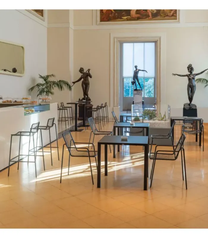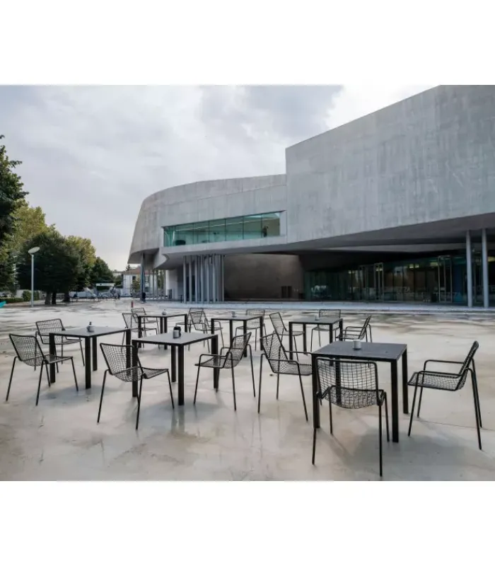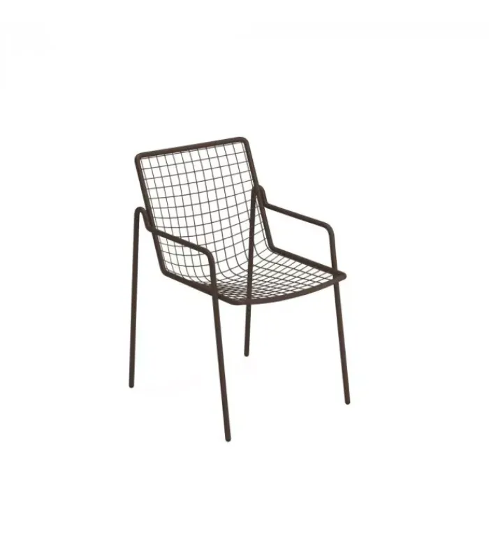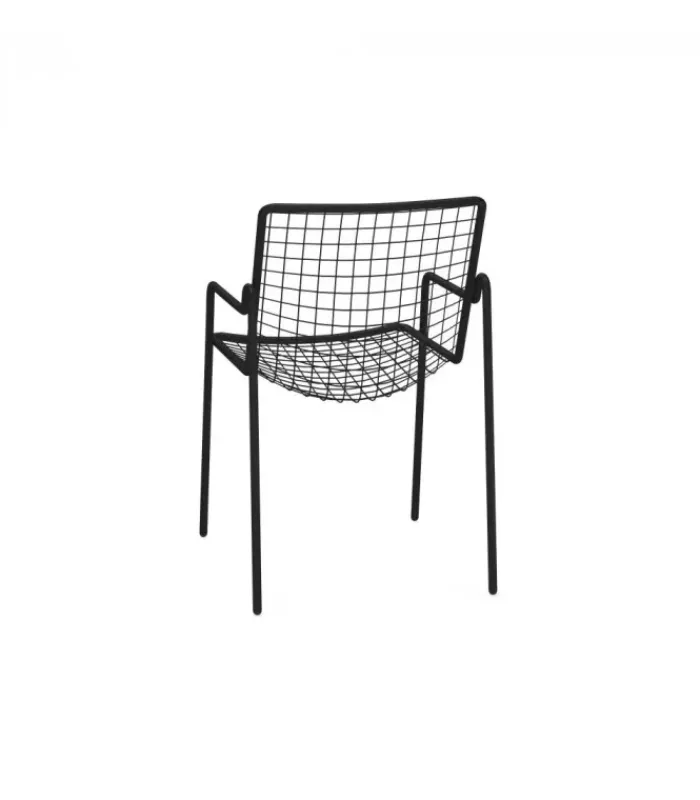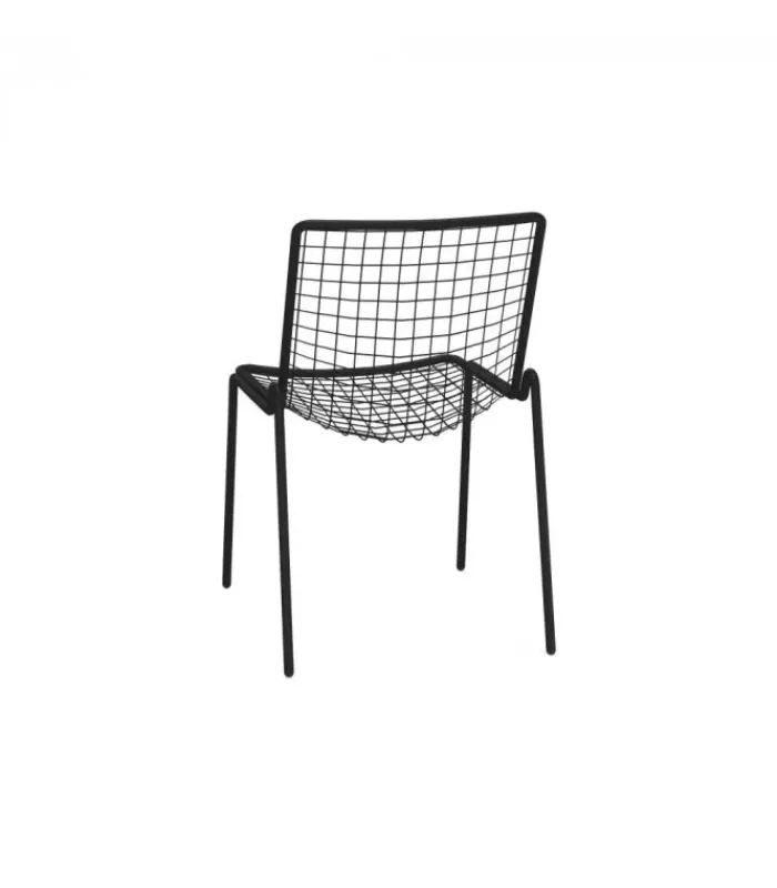 Sedia con seduta e schienale a rete intrecciata in acciaio pre zincato a caldo e verniciato. La struttura è in acciaio verniciato. È disponibile nella versione con o senza braccioli ed in moltissimi colori diversi. È impilabile (per un massimo di 8 sedie impilate) ed è venduta in stock da 4 sedie.