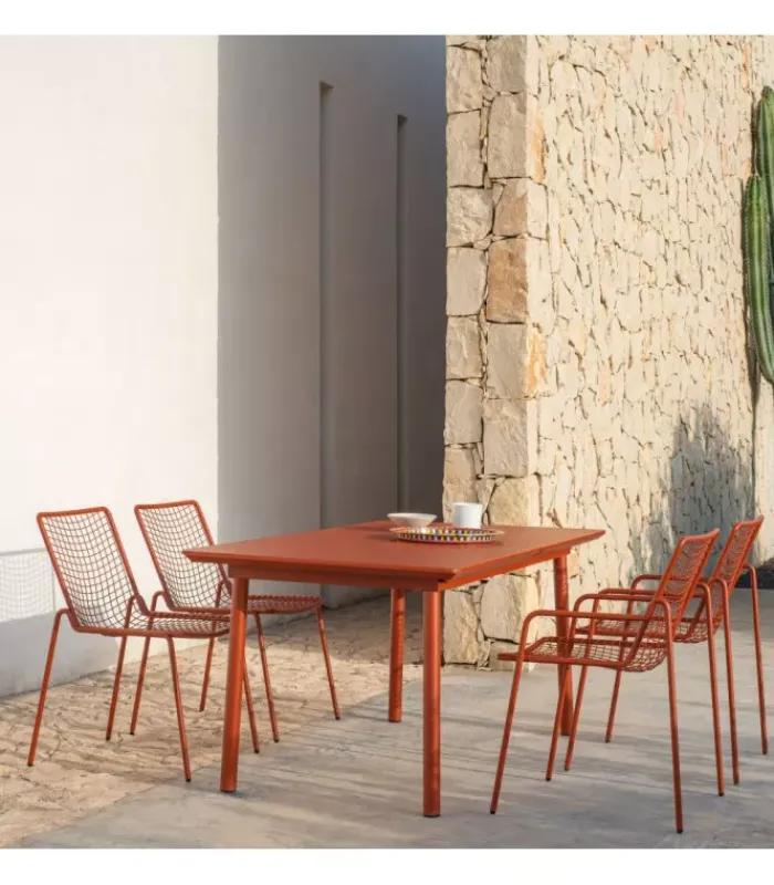 RIO R50 è una collezione completa di sedute composta da sedia e poltroncina dining, poltrona lounge disponibile anche nella versione dondolo, sgabello e tavolo basso. RIO R50 ha una struttura in tubo di acciaio di tipologia ASFORM, acciaio di alta qualità con elevate capacità meccaniche e alta resistenza al carico del peso. La lavorazione dà al tubo un segno fortemente connotato, una lettera R, che si individua nella zona di giunzione tra seduta e schienale. Tutte le saldature di tipo strutturale sono eseguite con tecnologia Mig che conferisce una maggiore resistenza agli sforzi e riduce il rischio ruggine mentre la rete di tondini di acciaio è, per avere una maggior precisione, elettrosaldata alla struttura. Come tutti i prodotti EMU in acciaio, è previsto un pretrattamento di cataforesi e successivamente un trattamento di verniciatura con polvere termoindurente, che conferisce al prodotto uno strato di vernice con spessore omogeneo con un alto grado di aderenza e resistenza. La presenza dei sottopiedi in nylon supporta la facilità di spostamento e di protezione delle estremità del prodotto.