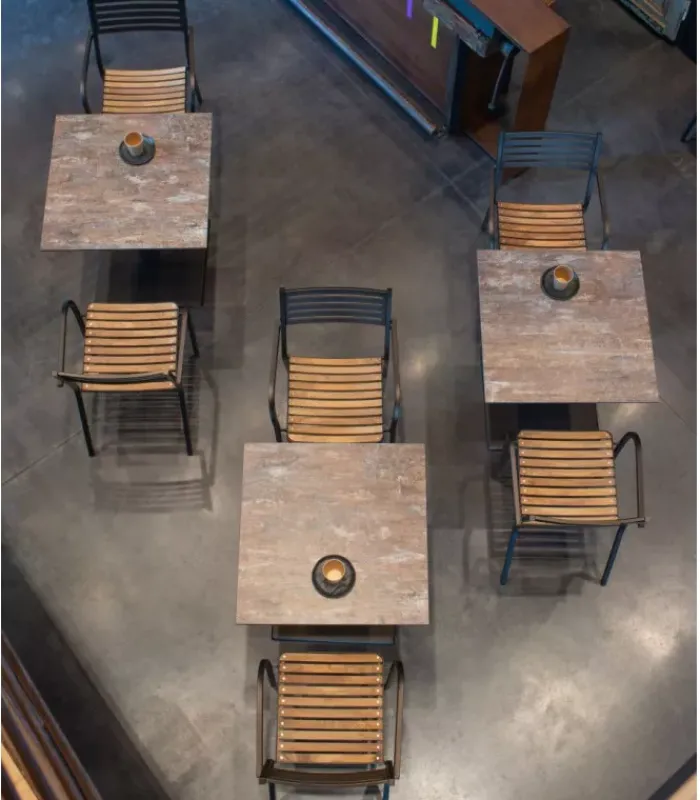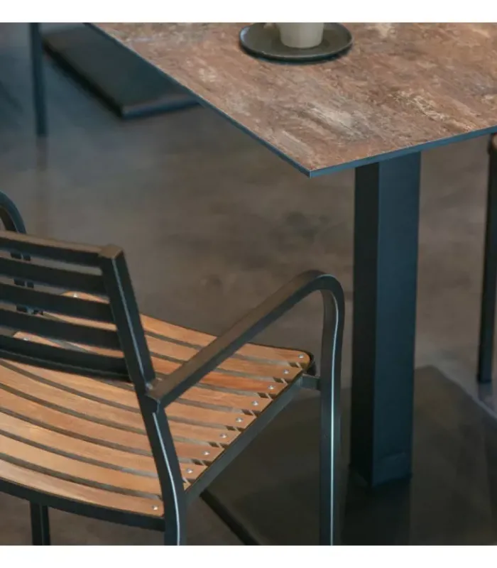 Sedia con struttura e schienale in acciaio verniciato, la seduta è in teak. È disponibile in cinque colori diversi ed è accessoriabile di cuscino. È impilabile (per un massimo di 8 sedie impilate) ed è venduta in stock da 4 sedie.