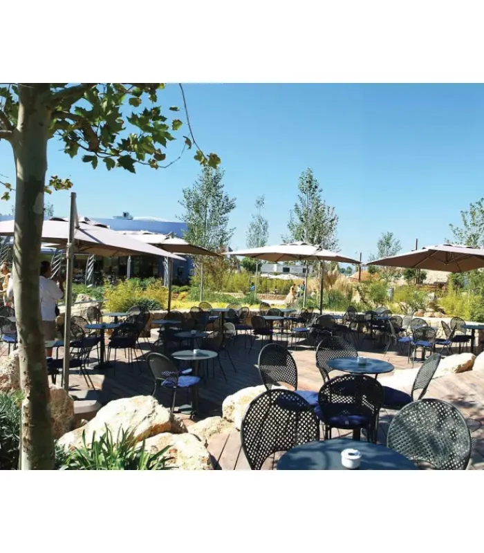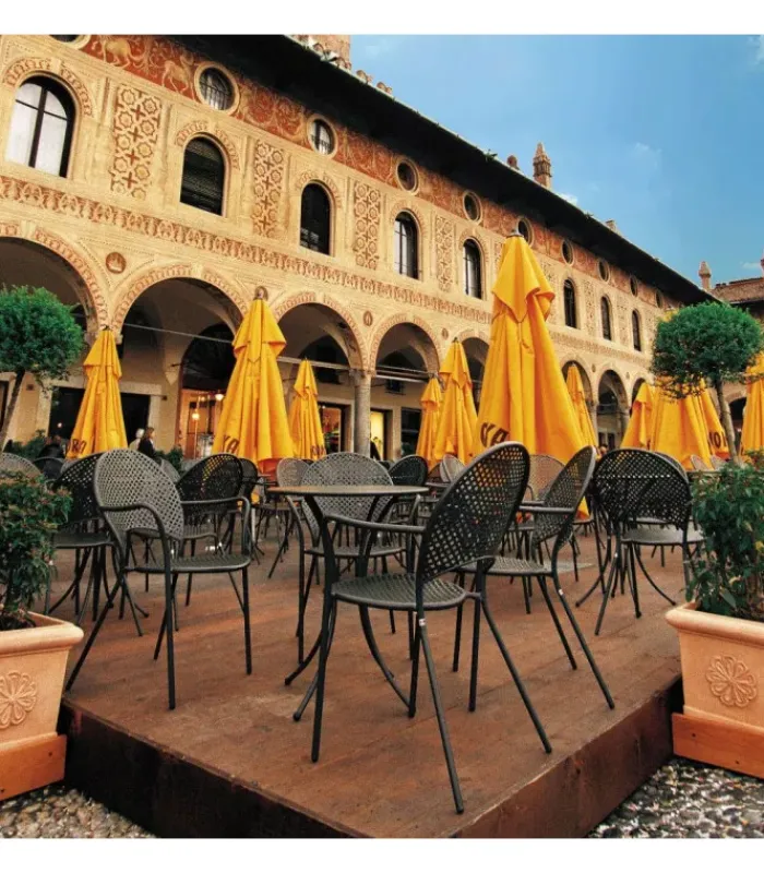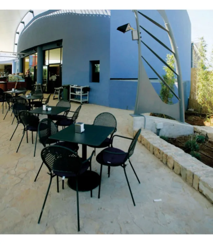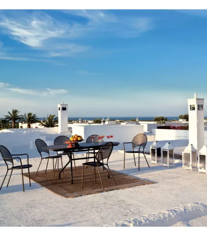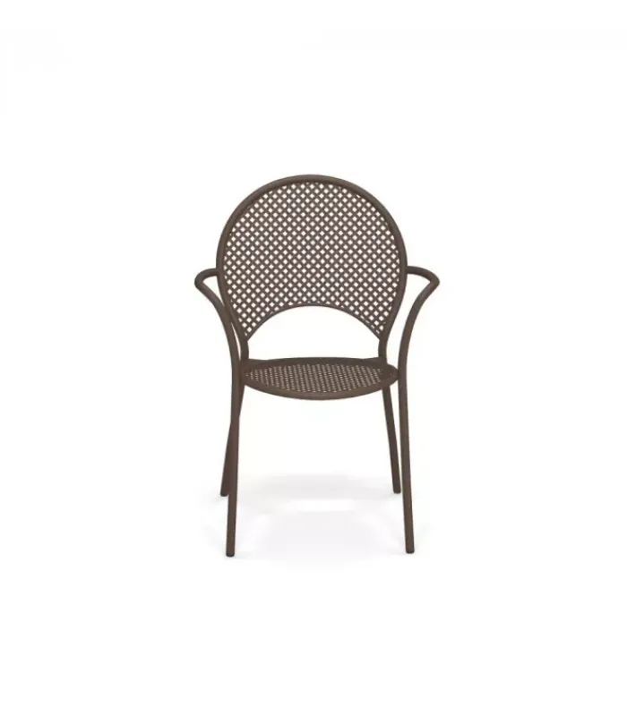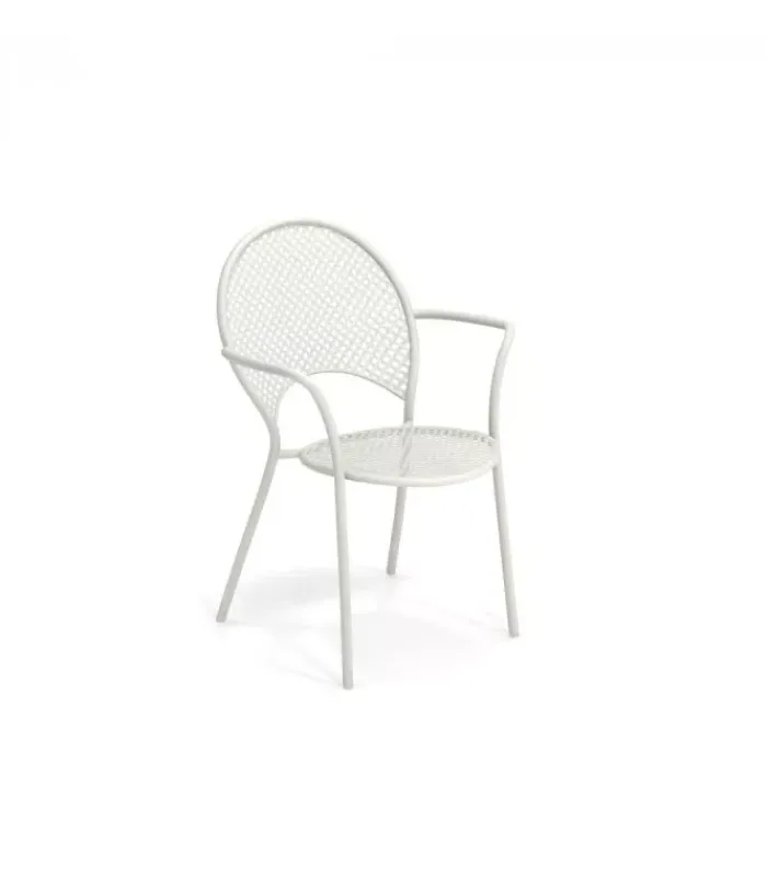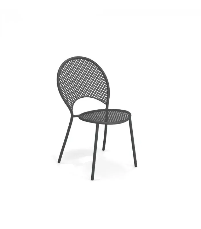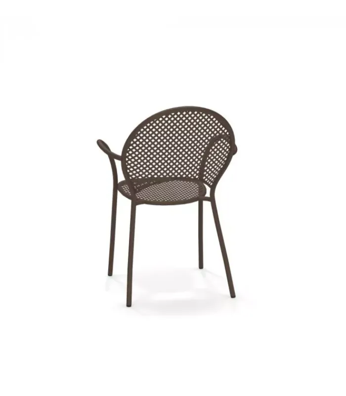 Sedia con struttura (con o senza braccioli) in acciaio verniciato, la seduta e lo schienale sono in lamiera a finto intreccio, pre zincata a caldo e verniciata. È disponibile in otto colori diversi ed è accessoriabile di cuscino. È impilabile (per un massimo di 4 sedie impilate) ed è venduta in stock da 4 sedie.