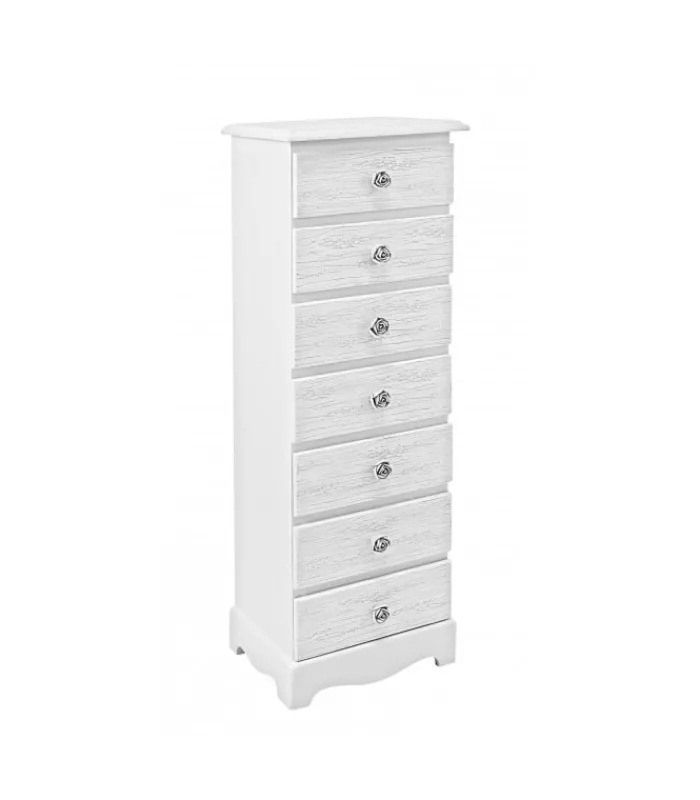 STRUTTURA IN MDF. FINITURA BIANCA OPACA, FRONTALI E PIANI CON EFFETTO DECAPATO. MANIGLIE IN POLIRESINA