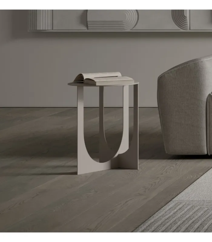 Un originale tavolino in lamiera con piano rotondo e struttura con taglio caratterizzante, per completare il tuo arredo con stile.