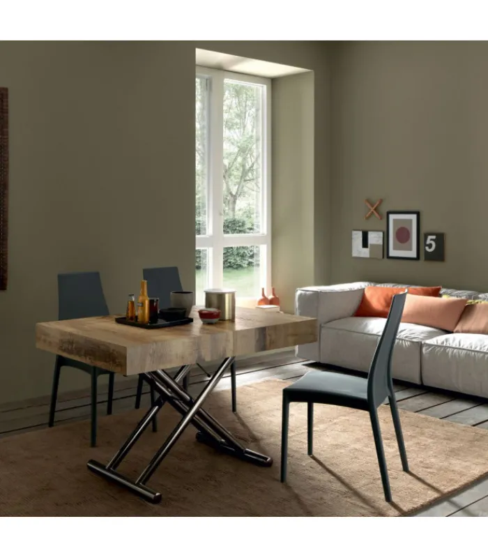 Tavolino trasformabile in tavolo da pranzo, base in metallo, meccanismo a gas, regolabile in altezza al millimetro da cm 25 a cm 76, piano rettangolare in nobilitato, laccato, legno o effetto malta, 2 prolunghe interne e 2 prolunghe esterne. Ruote a scomparsa. Gambe pieghevoli di supporto.