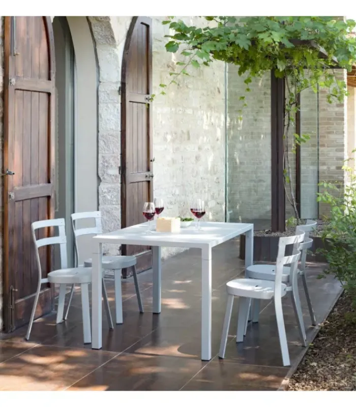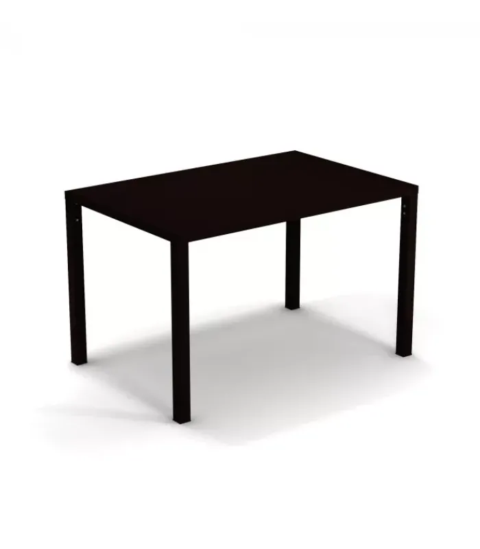 Tavolo con struttura in acciaio verniciato e piano in lamiera pre zincata a caldo e verniciata, disponibile in moltissimi colori. È impilabile (per un massimo di 9 tavoli impilati).