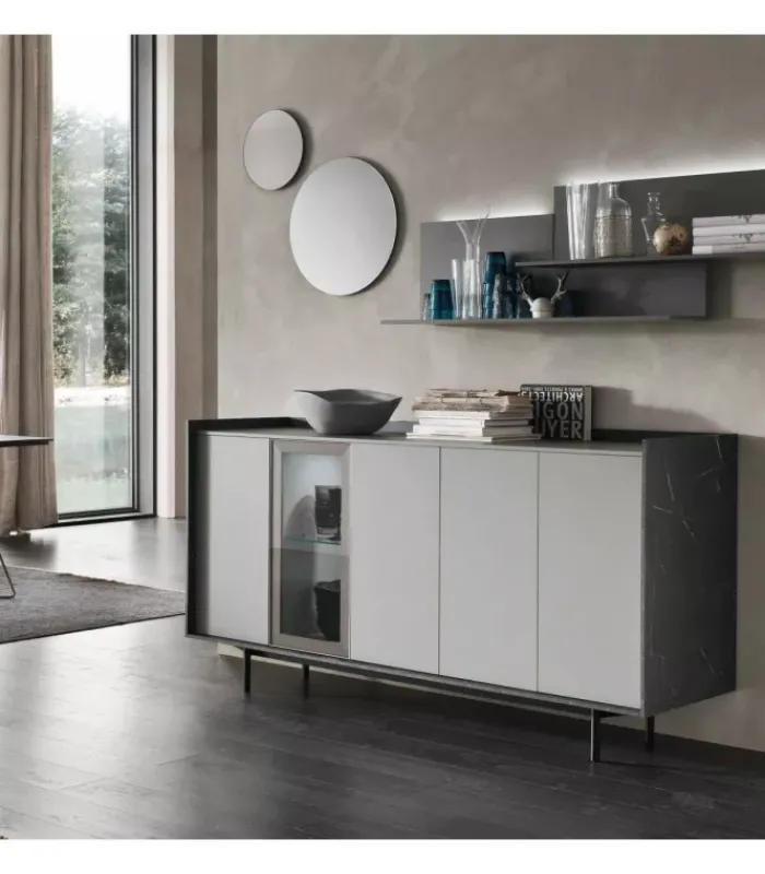 Madia con 4 ante in legno e 1 anta con telaio “Glax”. L’apertura è push pull. È accessoriata internamente di 2 ripiani in legno spessi 18 mm. È disponibile in melaminico, in frassino colore, in laccato opaco, in laccato lucido e in rovere impiallacciato. Le finiture possono essere differenti tra frontale/top e struttura. La struttura interna di serie è in melaminico ghiaccio. Madia montata (smontabile). Si consiglia l’ancoraggio a muro.