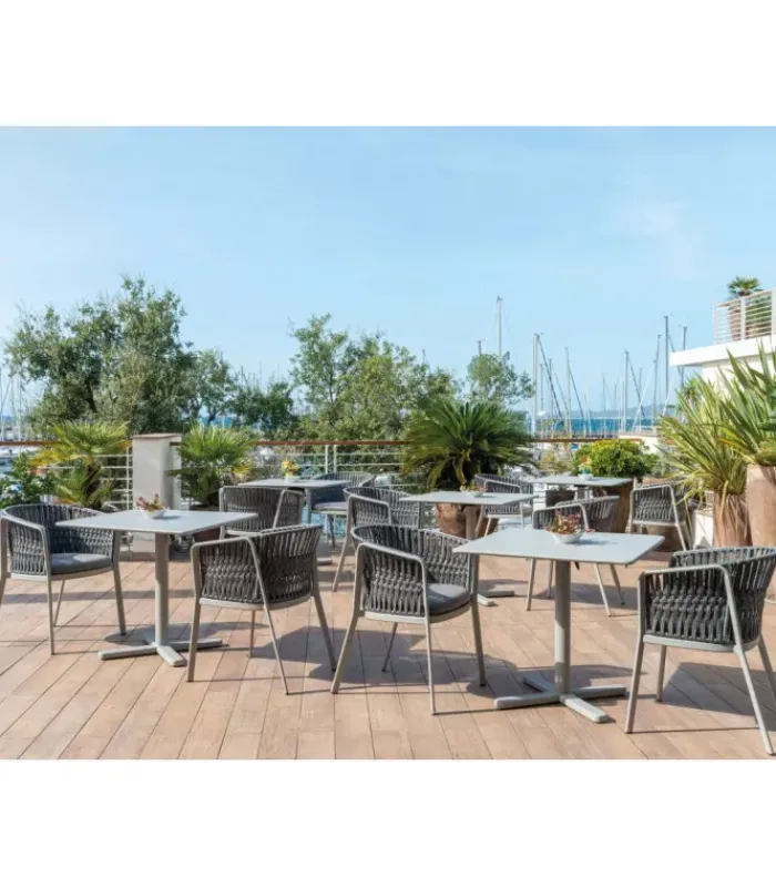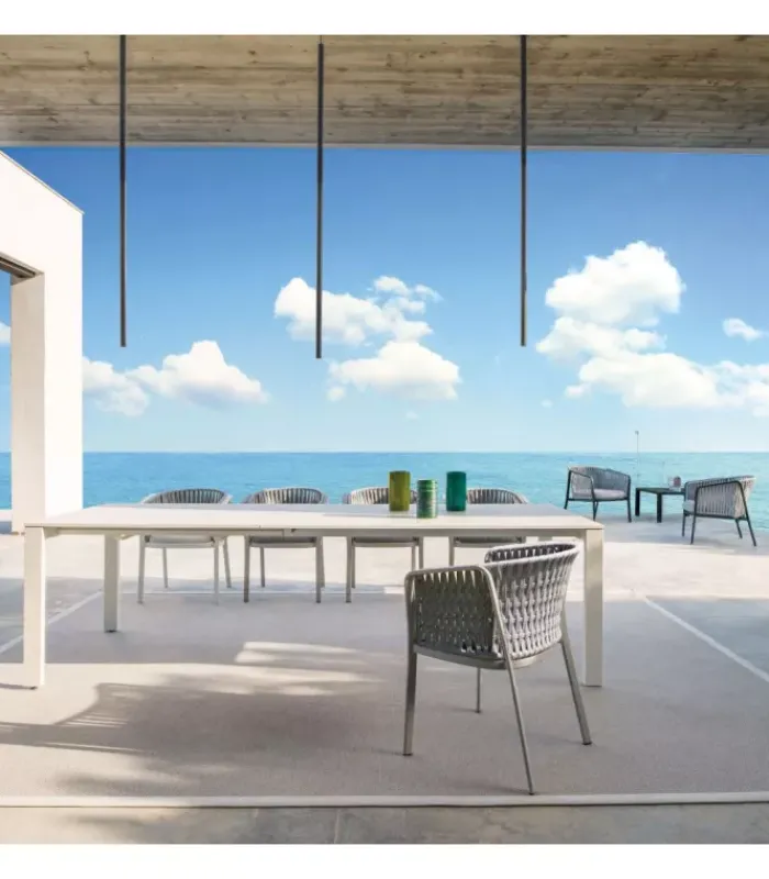 La collezione Carousel si compone di quattro versioni di poltroncina dining, tre versioni di poltrona lounge, divano, pouf, coffee table quadrato e rettangolare. Nelle sedute, la struttura a cavalletto è in tubolare di alluminio. Il sedile, costituito da una lamiera in lega di alluminio che viene imbutita per conferire una forma pulita, é successivamente fissato alla struttura di alluminio attraverso una saldatura di tipo strutturale, eseguita con tecnologia TIG che conferisce particolare resistenza oltre che un miglior standard a livello estetico. La struttura dello schienale è in acciaio ed è il supporto su cui sono realizzati gli intrecci decorativi nei vari materiali proposti. Tutti i materiali selezionati garantiscono una resistenza e una stabilità del colore. Per la poltroncina dining è prevista una versione in tessuto tecnico quale propilene in fibra Fiber Fill, con cui viene realizzato un cuscino sedile e uno schienale autoportante. Questi materiali garantiscono idrorepellenza, per questo il prodotto è particolarmente idoneo in tutti gli usi di ambienti marini e in condizioni climatiche estreme. I pouf hanno una struttura in tubolare ovale di alluminio mentre i tavoli hanno una struttura in tondino di acciaio con piano in lega di alluminio e sottopiedi regolabili in nylon e vite inox. Tutti decorati con intreccio di corda.