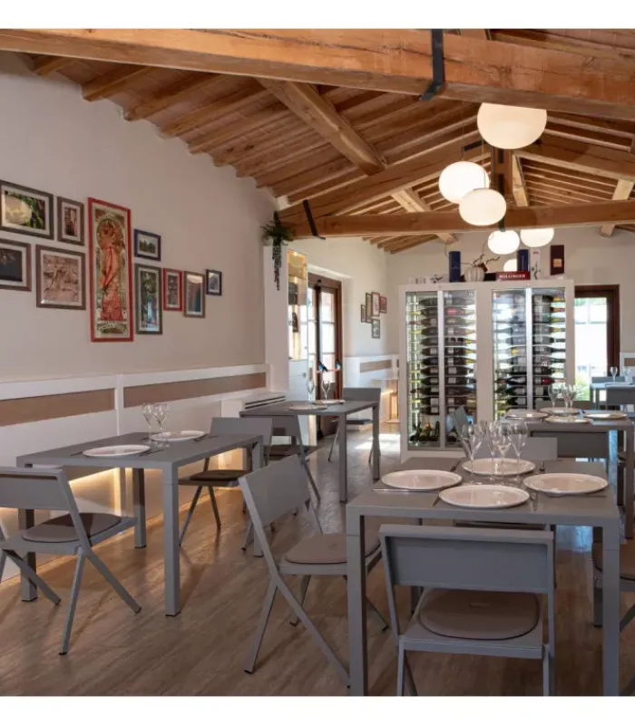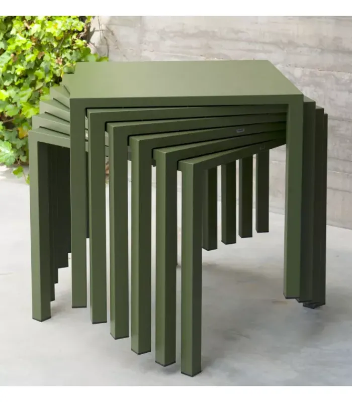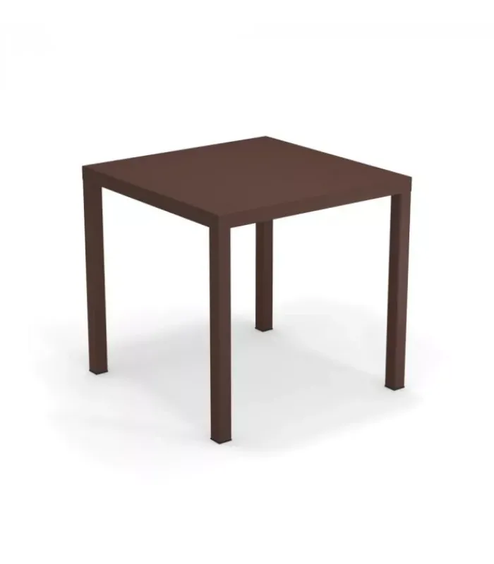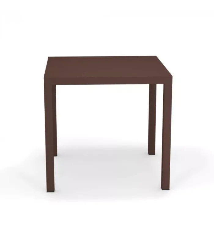 Tavolo con struttura in acciaio verniciato e piano in lamiera pre zincata a caldo e verniciata, disponibile in tre diverse dimensioni e moltissimi colori. È venduto in stock da 2 tavoli ed è impilabile (per un massimo di 9 tavoli impilati).