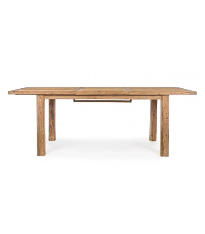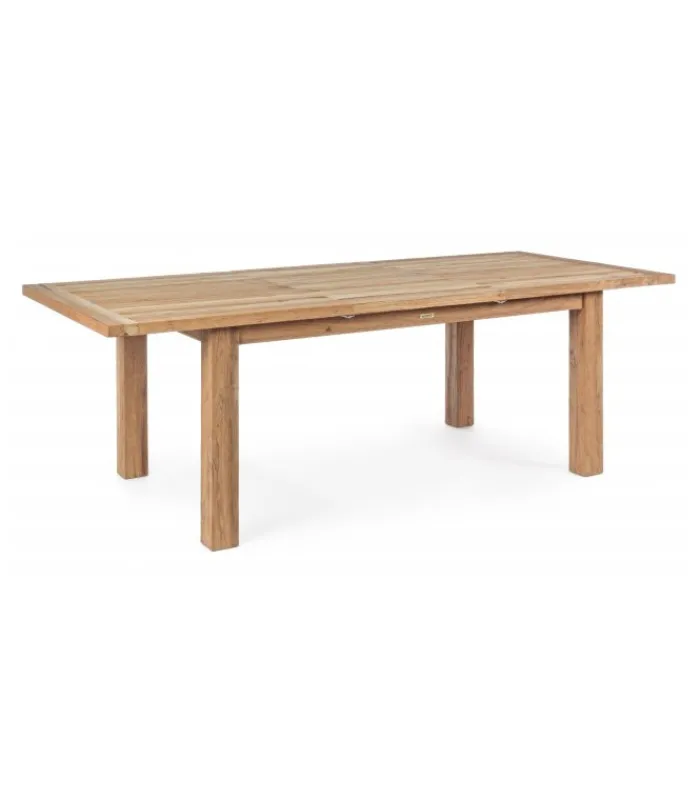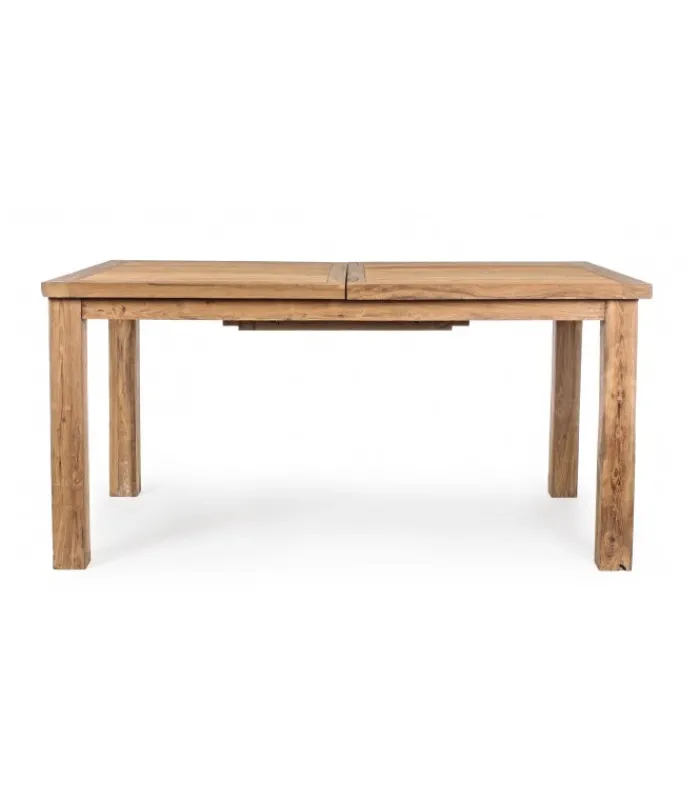 Teak riciclato, finitura rustica- spessore piano 4 cm, gamba 8,5×8,5 cm- ferramenta in acciaio inossidabile- barra di scorrimento in alluminio- prolunga centrale a farfalla- nota: il legno riciclato prevede in produzione ritagli di legno a copertura dei fori originariamente presenti nel prodotto- dato l’utilizzo di diverse tipologie di legno, eventuali fessurazioni sono da considerarsi come caratteristica naturale di questo articolo- gambe da assemblare.