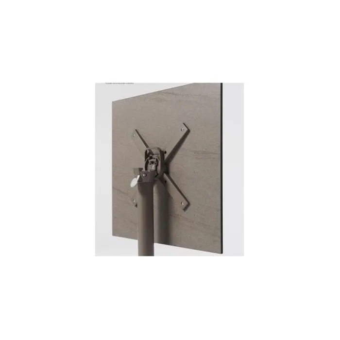 Basamento in alluminio Pressofuso verniciato e munito di meccanismo per ribaltare il piano, consentendo di riporre il tavolo in spazi ridotti e di accostarli (impilarli).