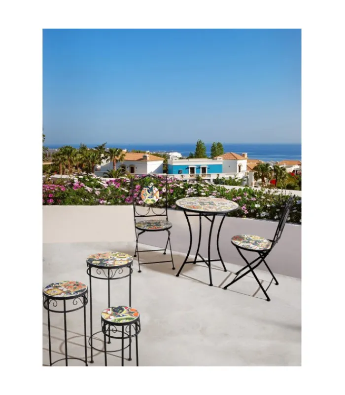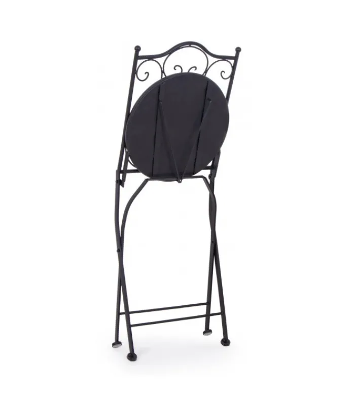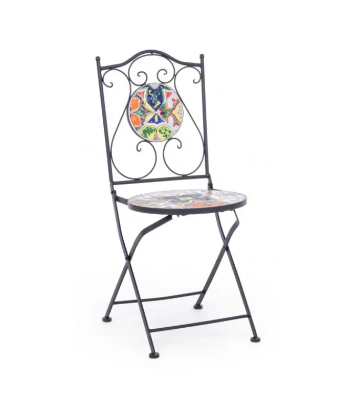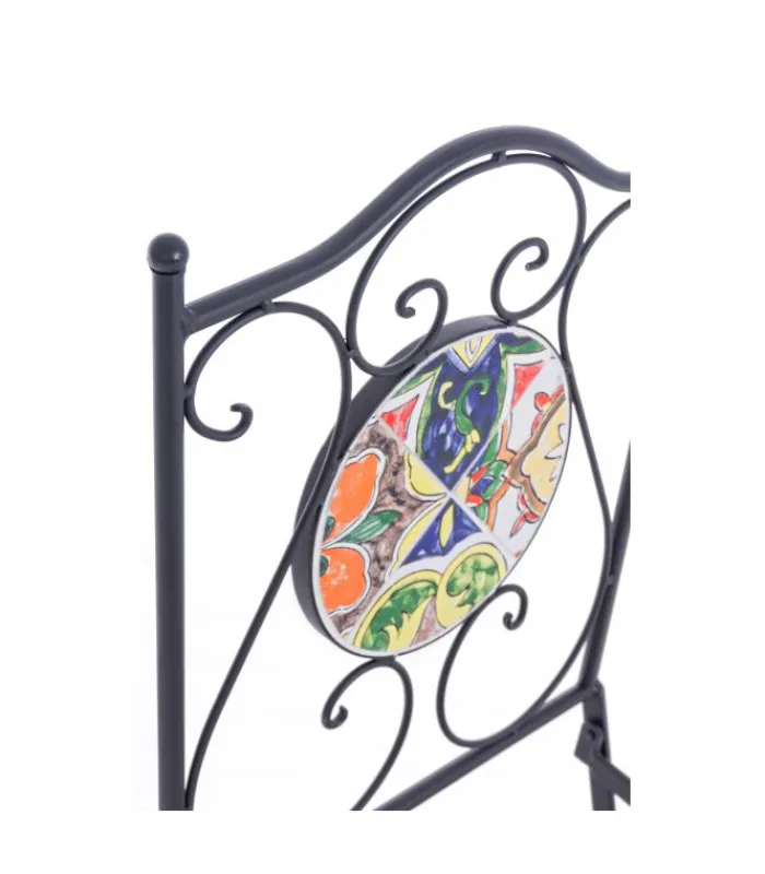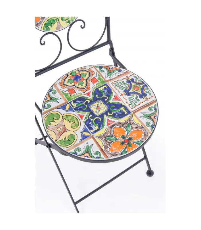 STRUTTURA IN ACCIAIO TRATTATO PER L’ESTERNO (E-COATING) E VERNICIATO A POLVERE EPOSSIDICA. SEDUTA E SCHIENALE CON DECORO IN CERAMICA. PIEGHEVOLE.