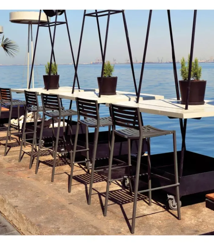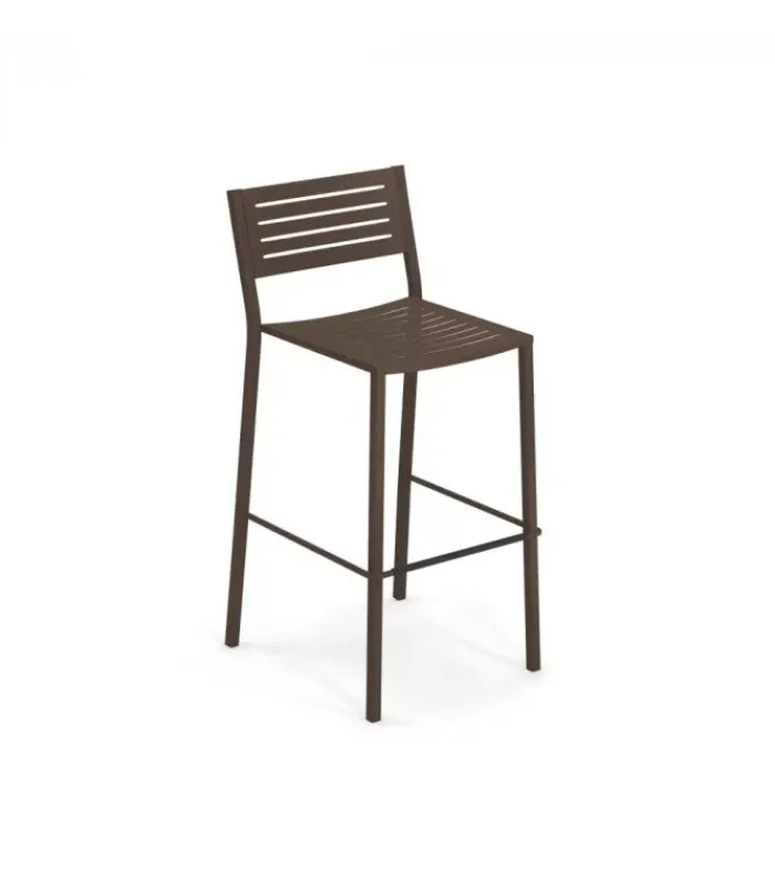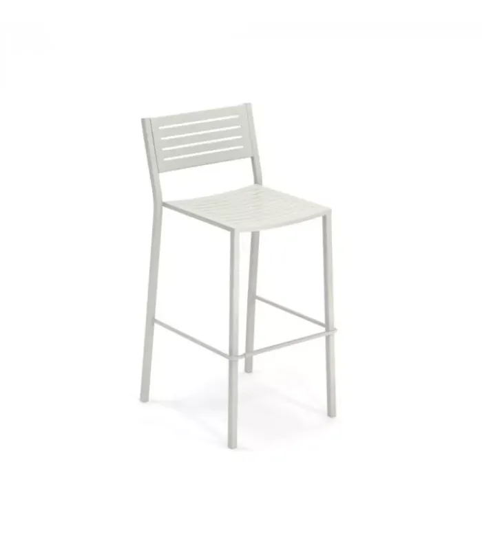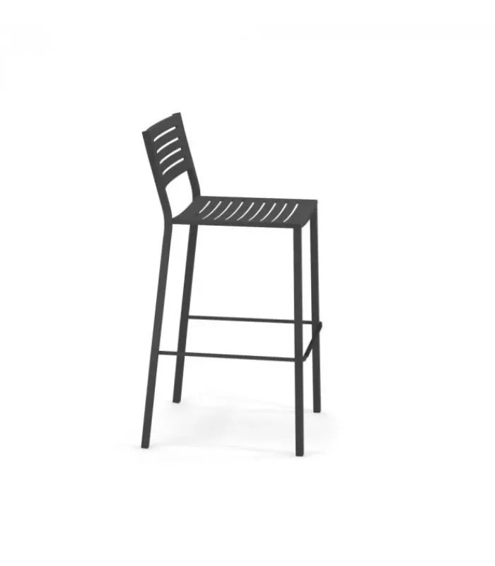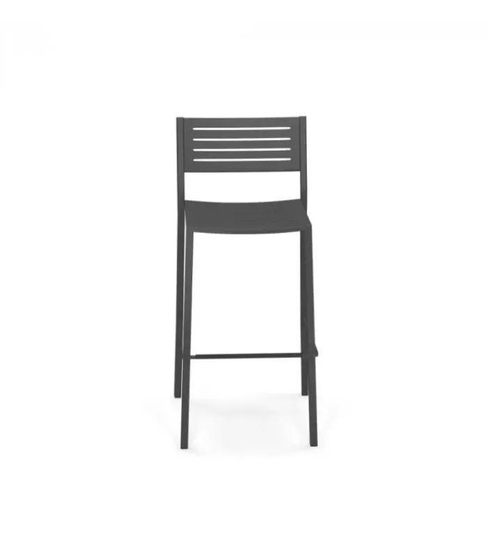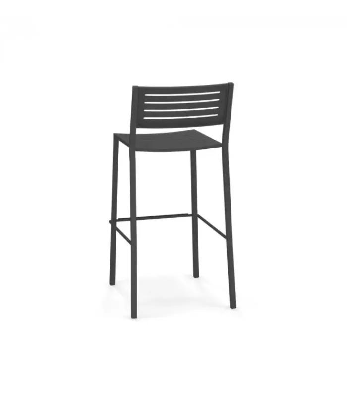 Sgabello con struttura in acciaio verniciato, la seduta e lo schienale sono in lamiera pre zincata a caldo e verniciata. È disponibile in cinque colori diversi ed è accessoriabile di cuscino. È impilabile (per un massimo di 8 sgabelli impilati) ed è venduto in stock da 4 sgabelli.