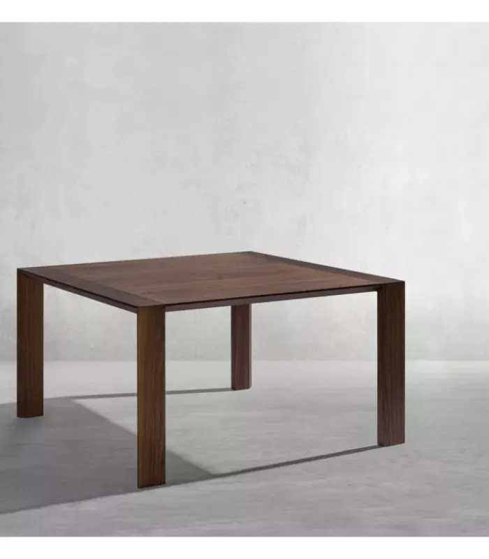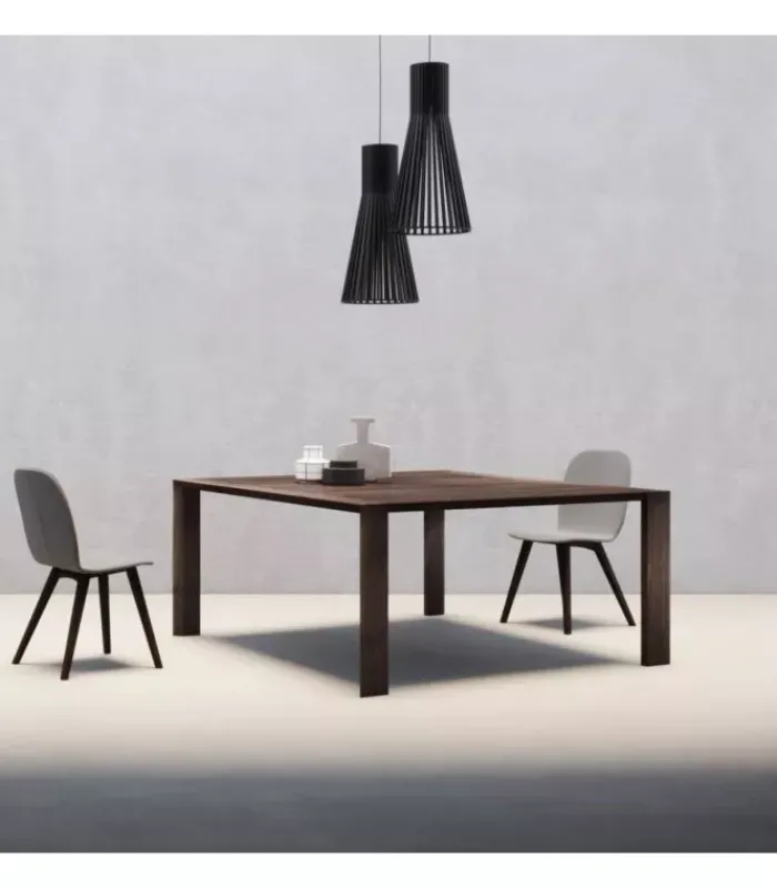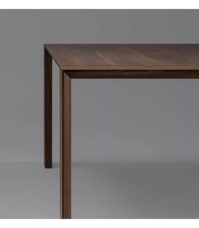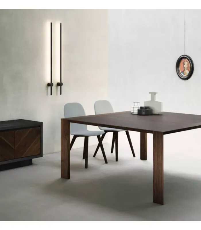 Tavolo fisso con piano bisellato impiallacciato su truciolare di pioppo. Gambe bisellate impiallacciate su lamellare. Dimensioni: H 77 cm, spessore 4 cm, gambe 13×4,5 cm con taglio a 45°. Disponibile in tutte le finiture.